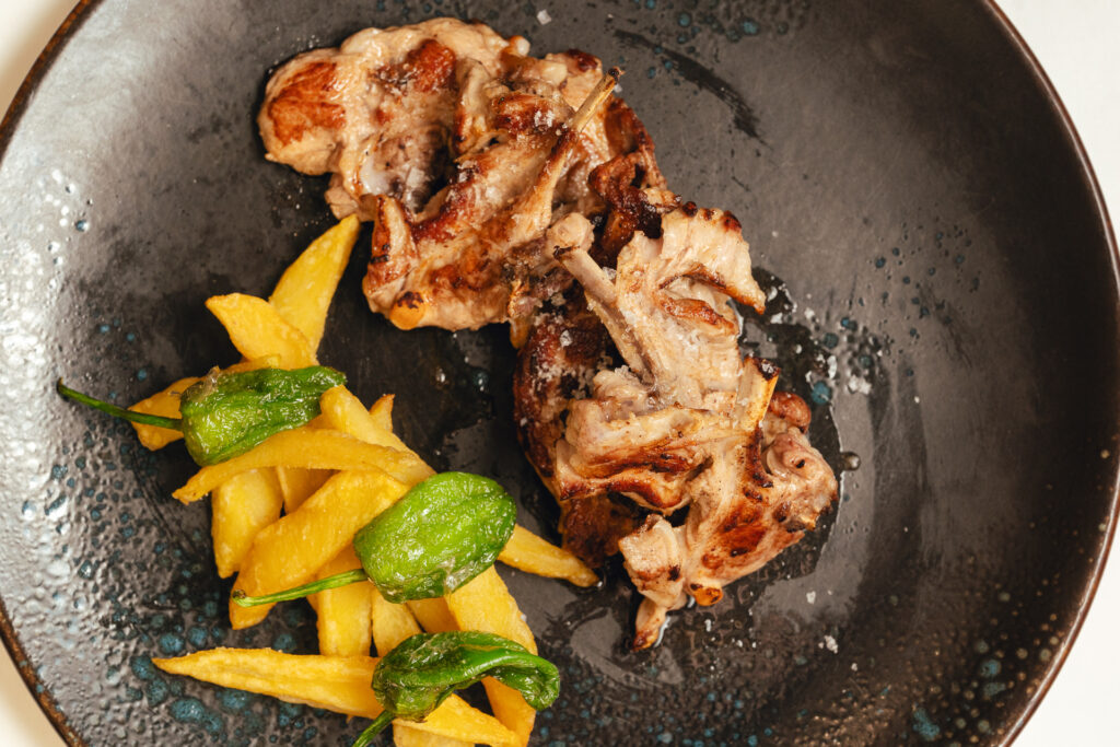 El chuletón de vaca a la parrilla es un homenaje a los carnívoros más exigentes. Su sabor intenso y jugoso, acompañado de patatas y pimientos del padrón, es una oda a los sabores tradicionales.